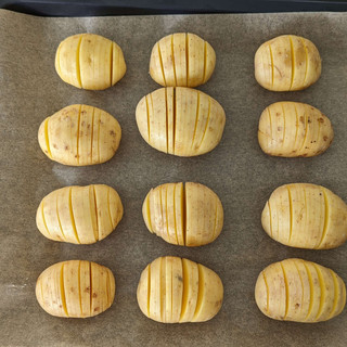 Die eingeschnittenen Kartoffeln auf das Backblech geben und mit Olivenöl bestreichen, etwas Salz drüberstreuen und ca. 1 Stunde backen.